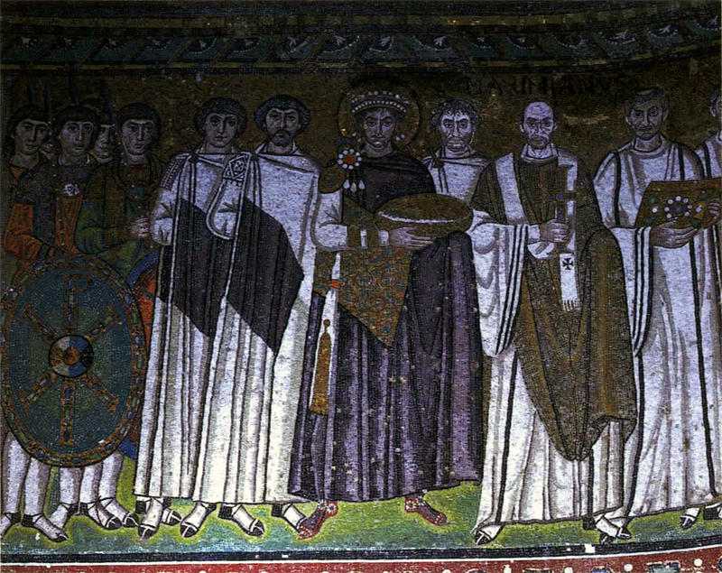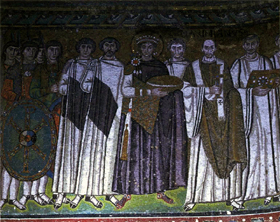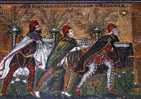 [ 東方の三賢者 ] 6世紀 [モザイク] サンタポリナーレ・ヌオーヴォ聖堂 ラヴェンナ(イタリア) | [ ユスティニアヌス帝、聖マクシミリアヌスと 随臣たち ] 6世紀中 [モザイク] サン・ヴィターレ聖堂 ラヴェンナ(イタリア) | [ デイシス(執り成し) 三連版イコン ] 6世紀 エルミタージュ美術館蔵 サンクト・ペテルスブルク(ロシア) |
