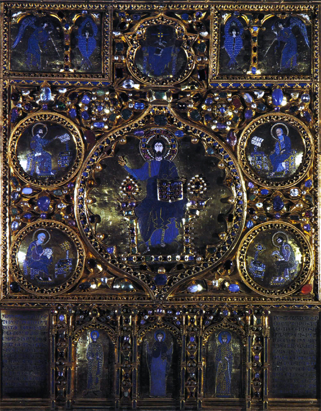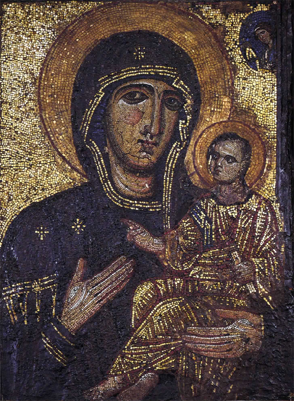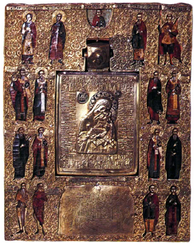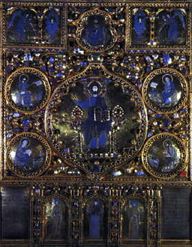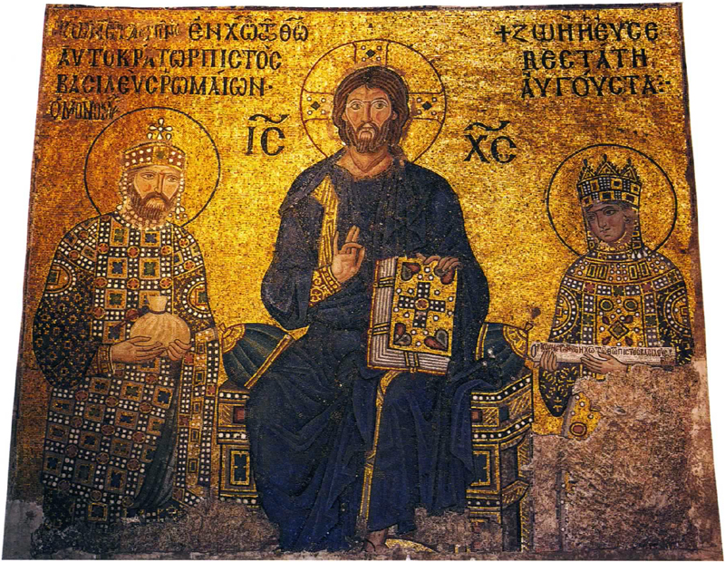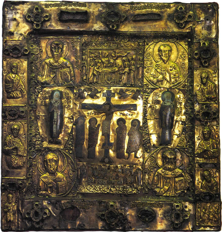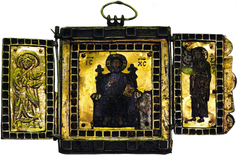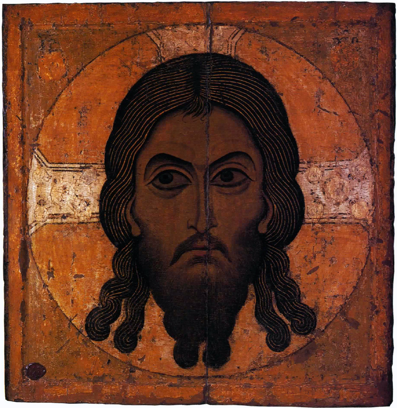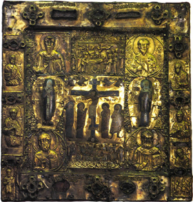 [ 奉献図 ] キリストを中央に皇帝コンスタン ティヌス・モノマコスと皇妃ゾエ 11世紀中〜12世紀 聖ソフィア大聖堂 [モザイク] イスタンブール(トルコ) | [ 聖顔−手で描かれざる主の御顔 ] 12世紀 ノヴゴロド出 トレチャコフ美術館蔵 モスクワ(ロシア) | [ 諸聖人を伴うキリストの磔刑と聖母の眠り ] 12世紀 エルミタージュ美術館蔵 [金属打ち出し] サンクト・ペテルスブルグ(ロシア) |