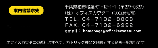 オフィスカワタニでは、個人のための巡礼立案、巡礼先やコースをご希望に沿って組むことも出来ます。ご遠慮なくお問い合せ、ご相談下さい。